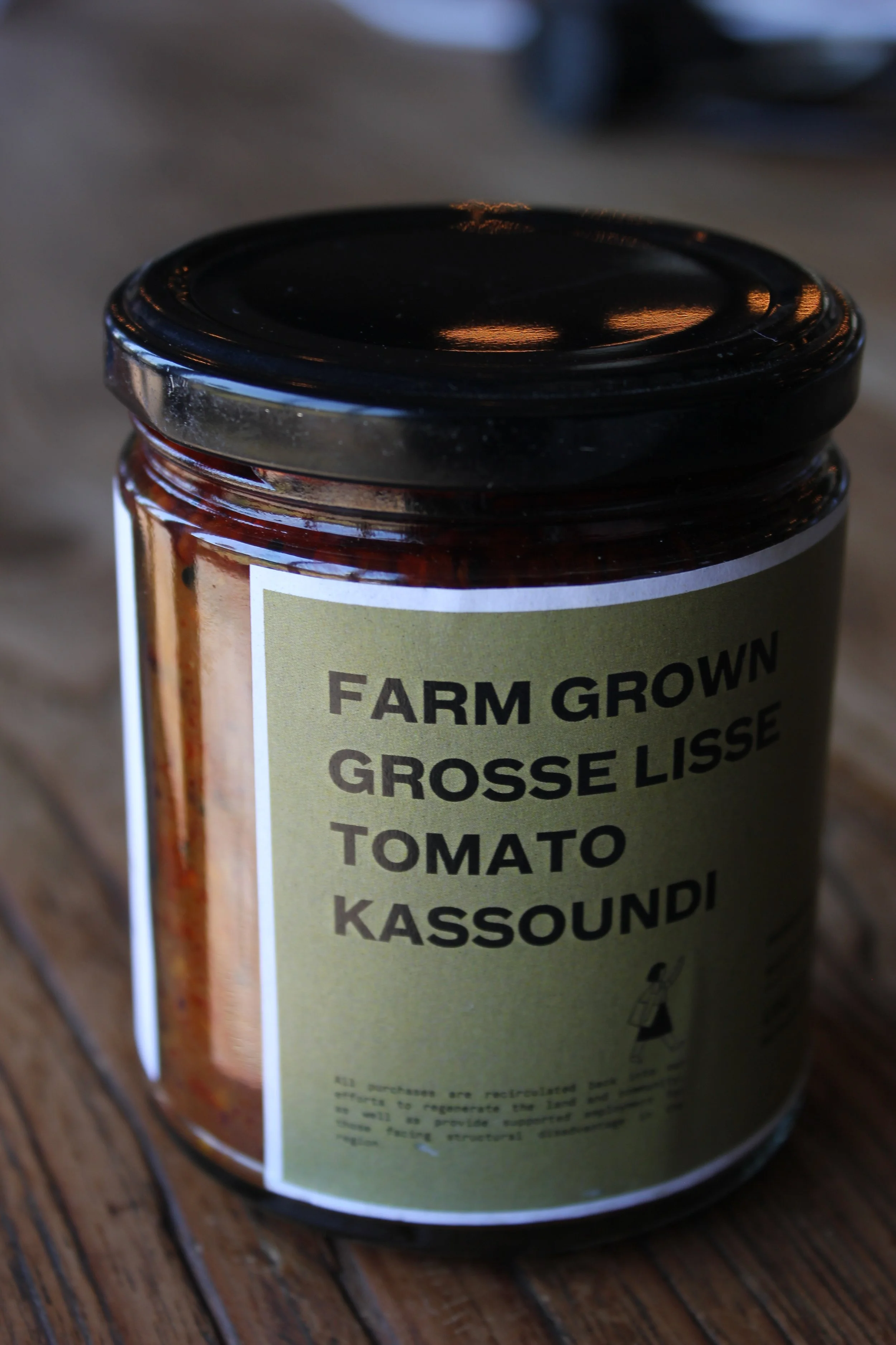 INGREDIENTS: Grosse Lisse Tomatoes from the farm, ginger, garlic, onions, green chillies, cider vinegar, vegetable oil, black mustard seeds, tumeric, cumin, smoked paprika, nigella seeds, coriander seeds, hot paprika, brown sugar, salt.